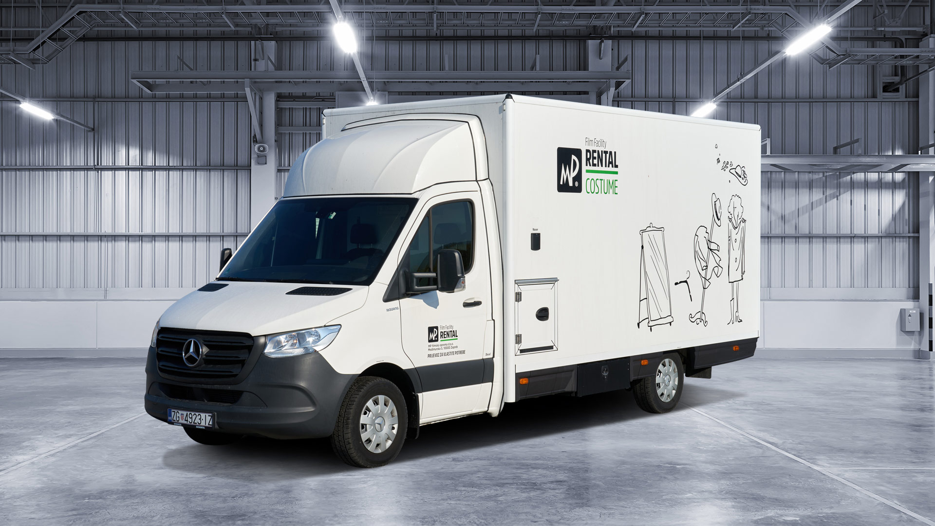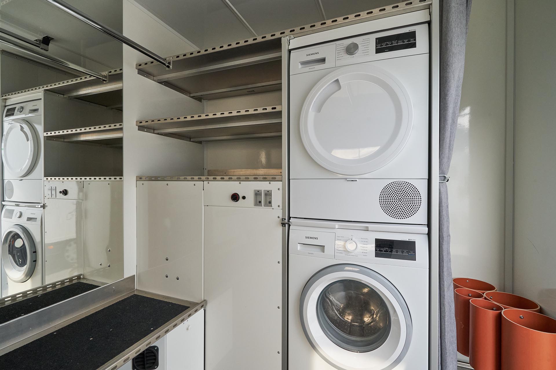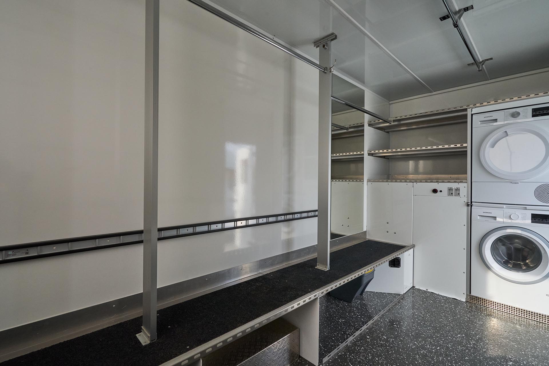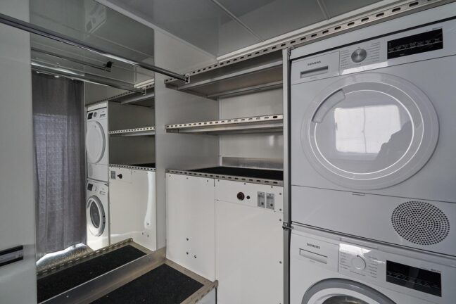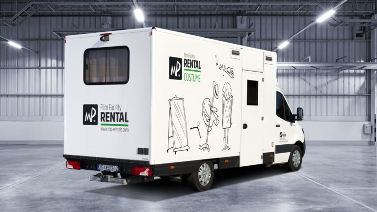 Our Costume Van is fully equipped with everything needed for costume continuity and care on set. The Costume Van supports the full wardrobe workflow on set — from storage and fitting to steaming and repairs. Inside, you’ll find built-in racks for hanging costumes, a work desk, ironing station, washer and dryer, and practical storage throughout.