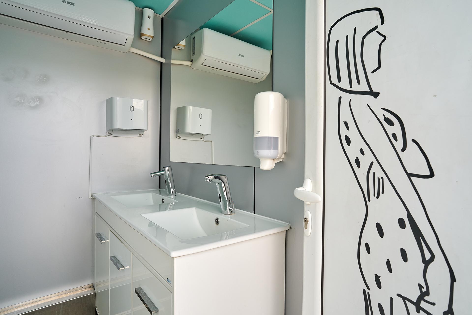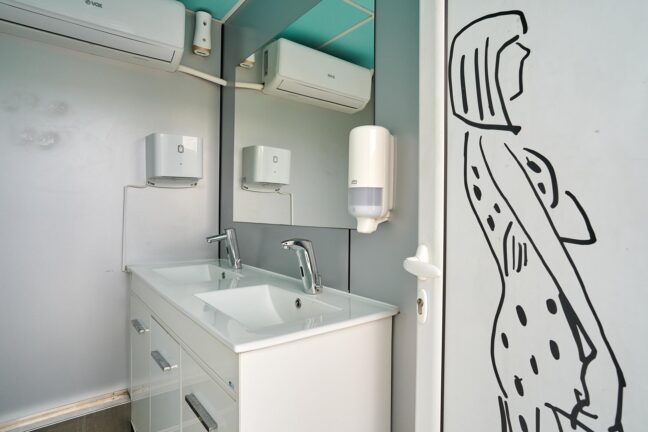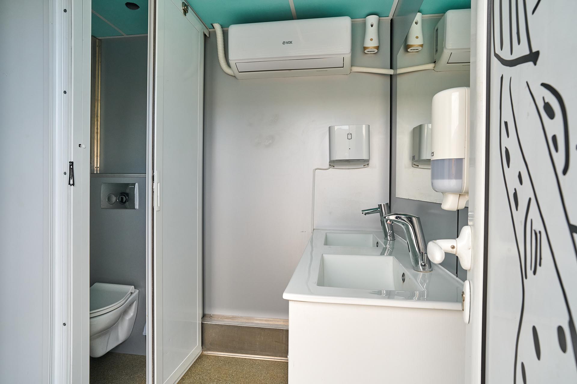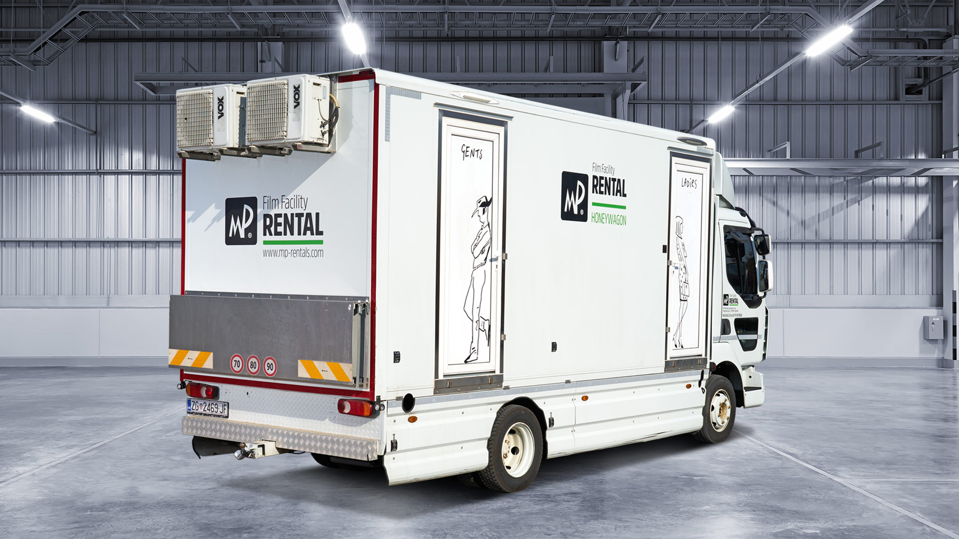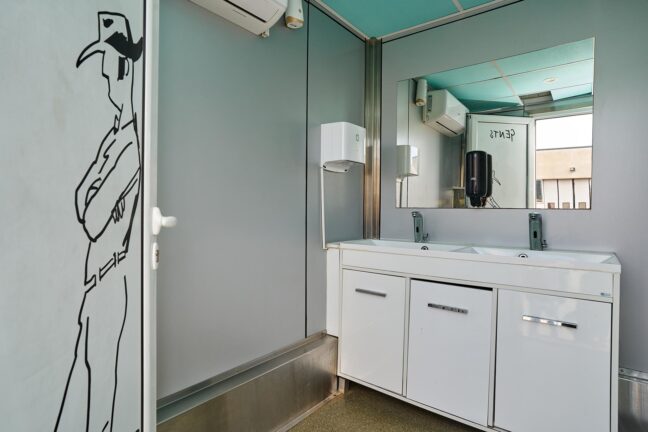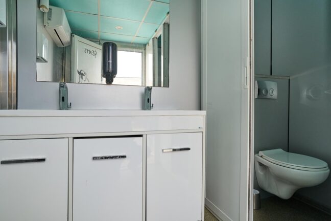 Our Large Honeywagon is a fully equipped mobile restroom trailer designed to support high-volume production environments. It offers separate entrances for Ladies and Gents, each section fitted with flushable toilets, sink with hot and cold water, and a hand dryer for added comfort and hygiene.