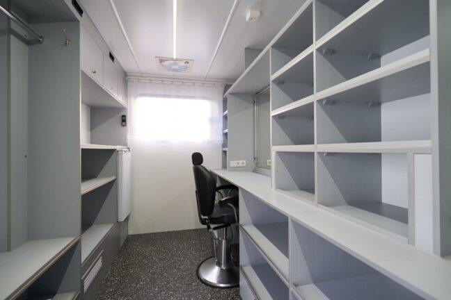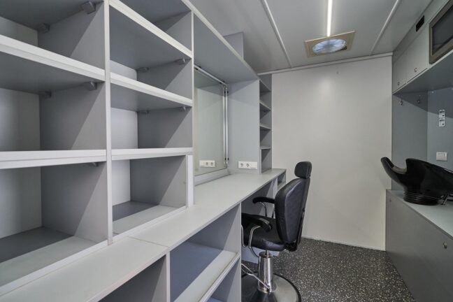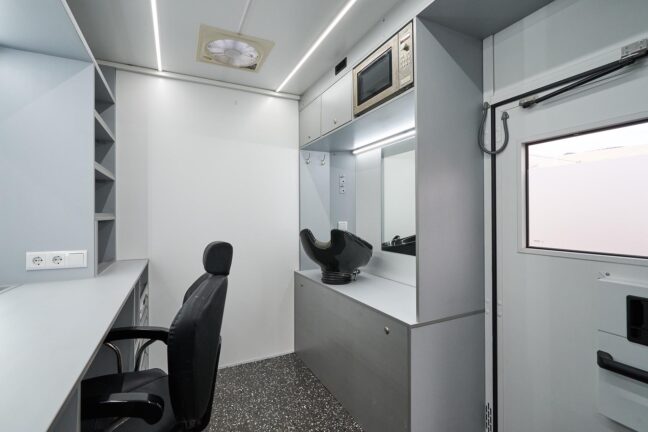 Each station includes a lighted makeup mirror, storage, adjustable chairs, and hot/cold water access. The van also includes air conditioning, heating, and frost protection to ensure comfort in any season.