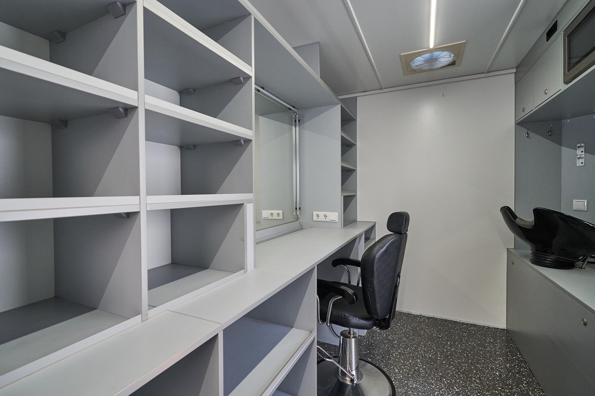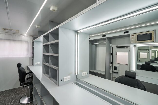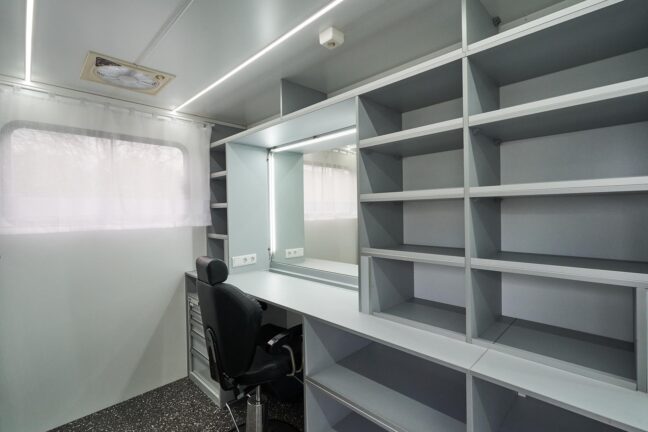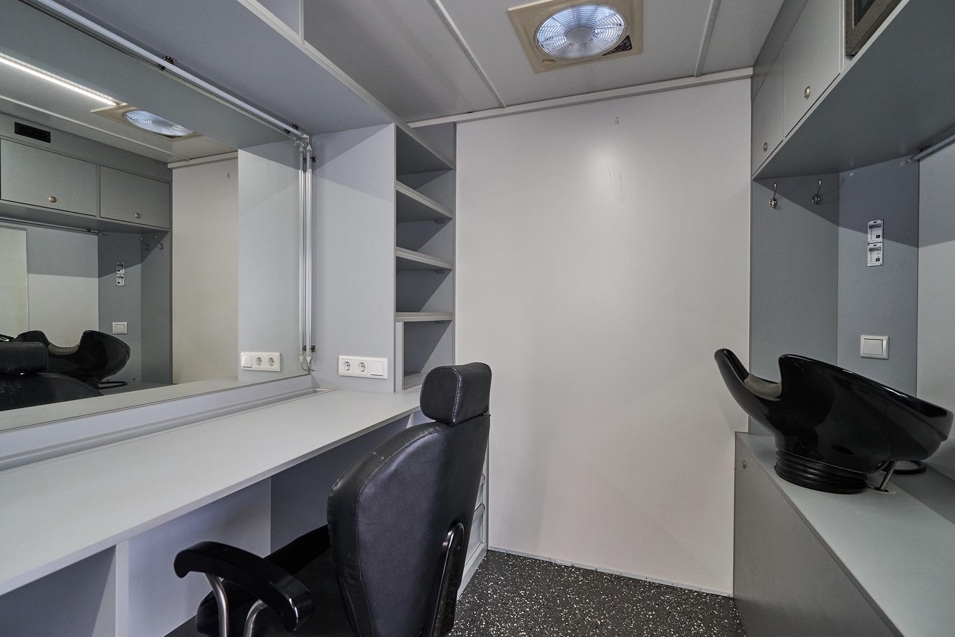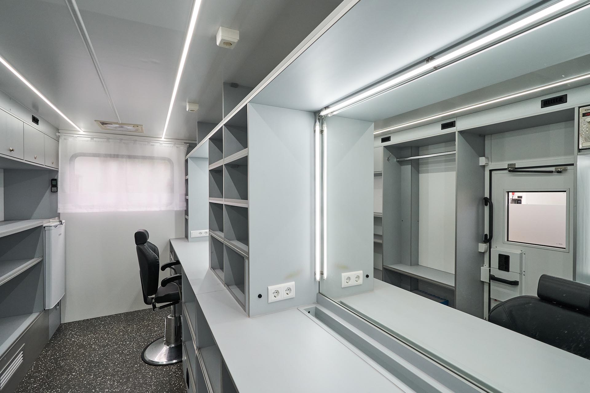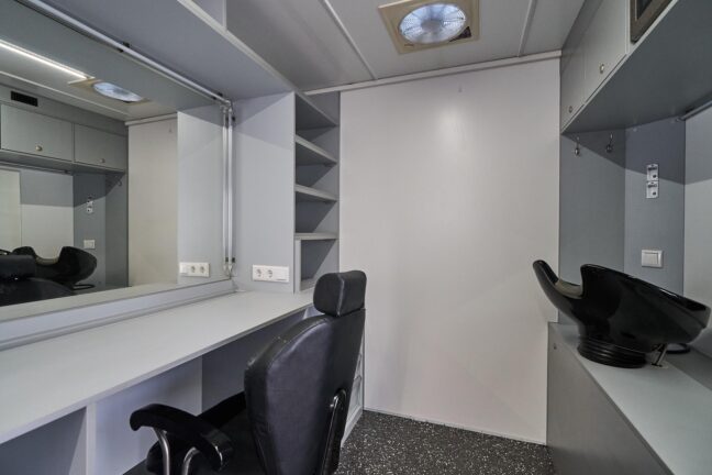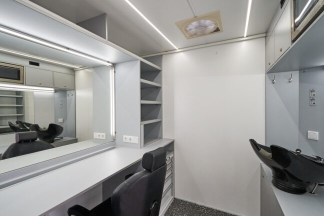 Our Makeup & Hair Van is a fully mobile beauty workspace equipped for both quick touch-ups and full prep sessions. With two spacious makeup stations, full-spectrum lighting, and proper ventilation, it offers artists everything they need — even in remote or compact locations.