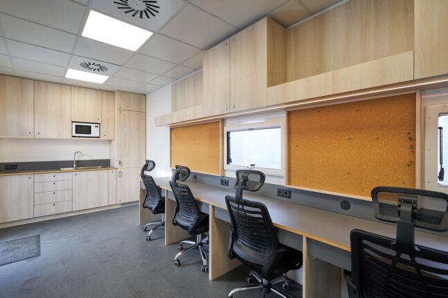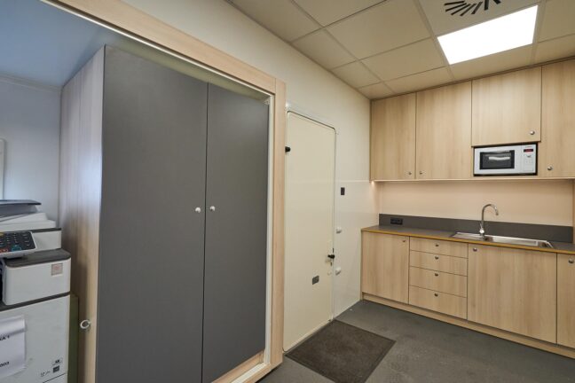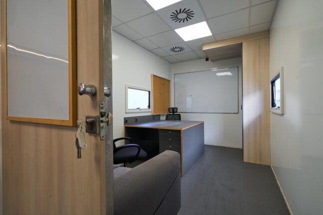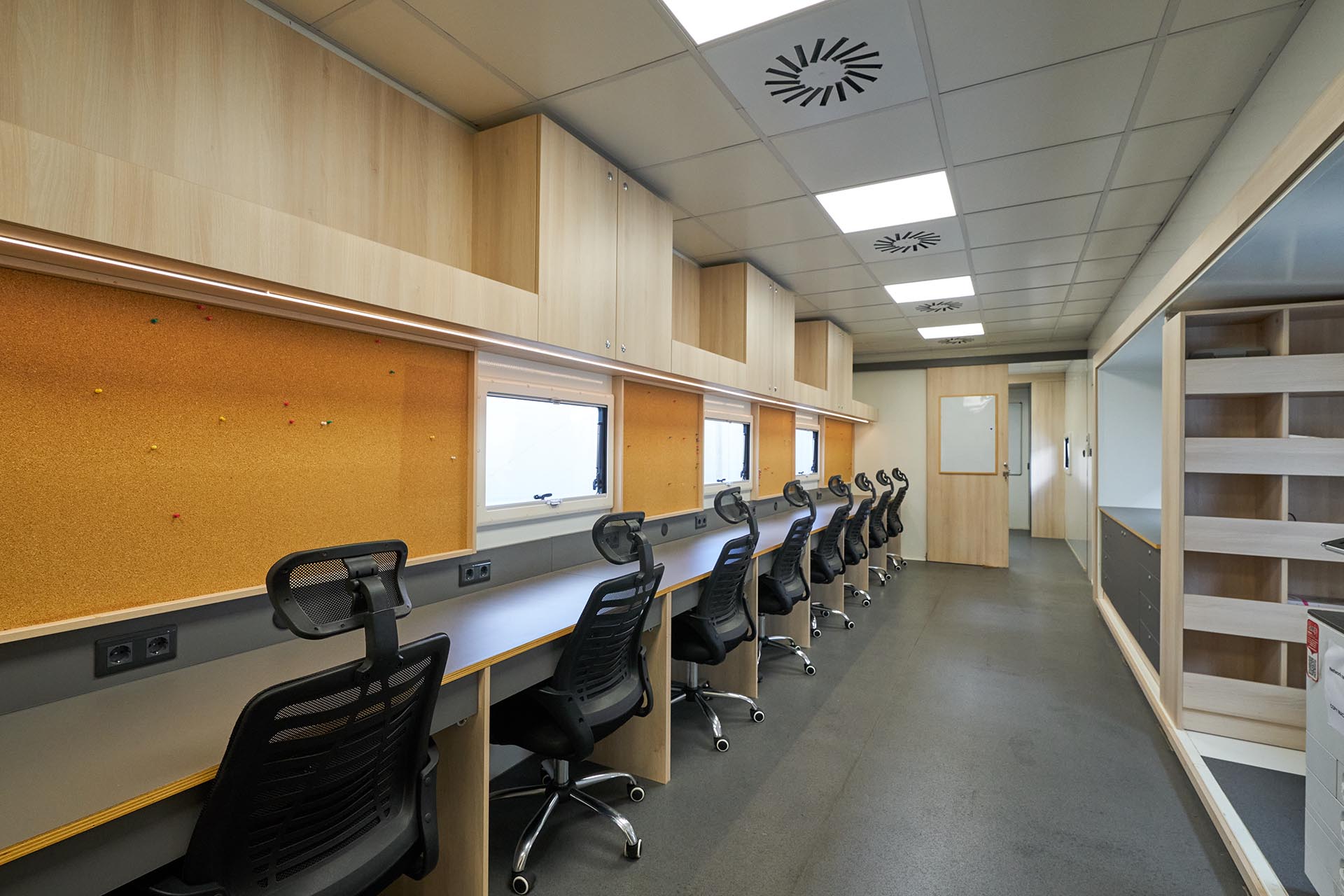 A private producer’s room provides two additional workstations in a more secluded area, ideal for producers, executives, or sensitive tasks requiring privacy.