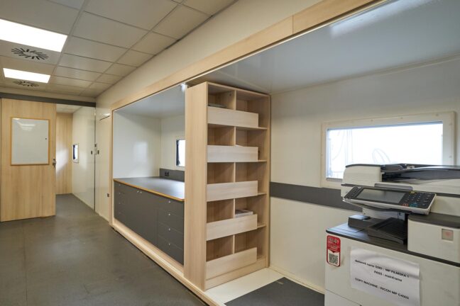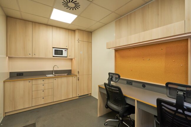 There’s also a compact kitchen corner equipped with a sink (hot and cold water), fridge and microwave.