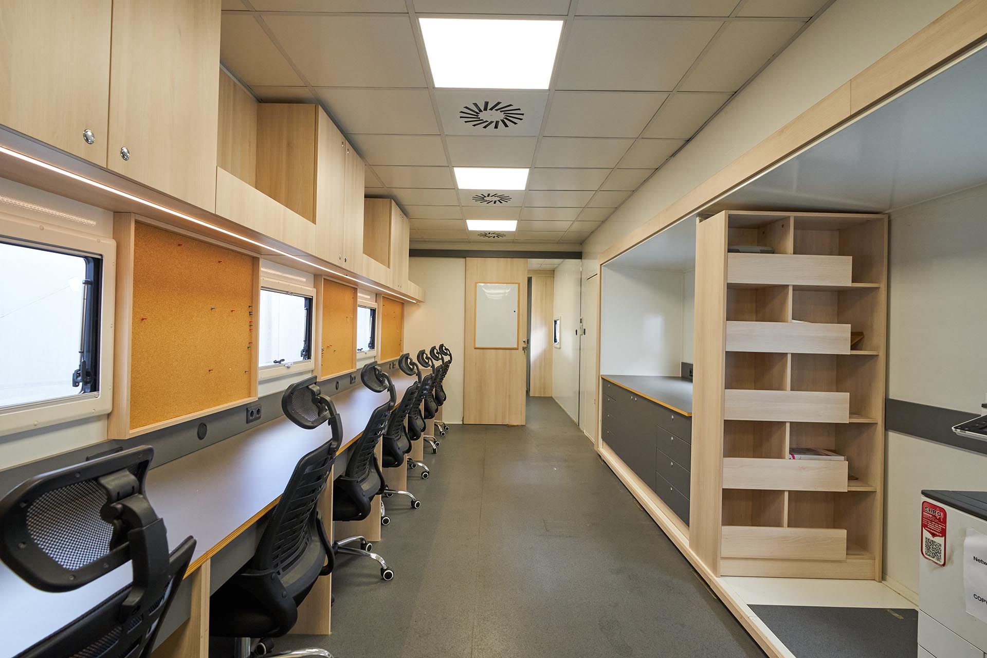 Our Production Office slide-out trailer offers a bright, air-conditioned workspace tailored for production crews who need a calm and organized environment on set. Built with one slide-out extension for added interior width, it comfortably accommodates 8 working stations, ensuring that producers, coordinators, and office staff can perform their tasks efficiently.