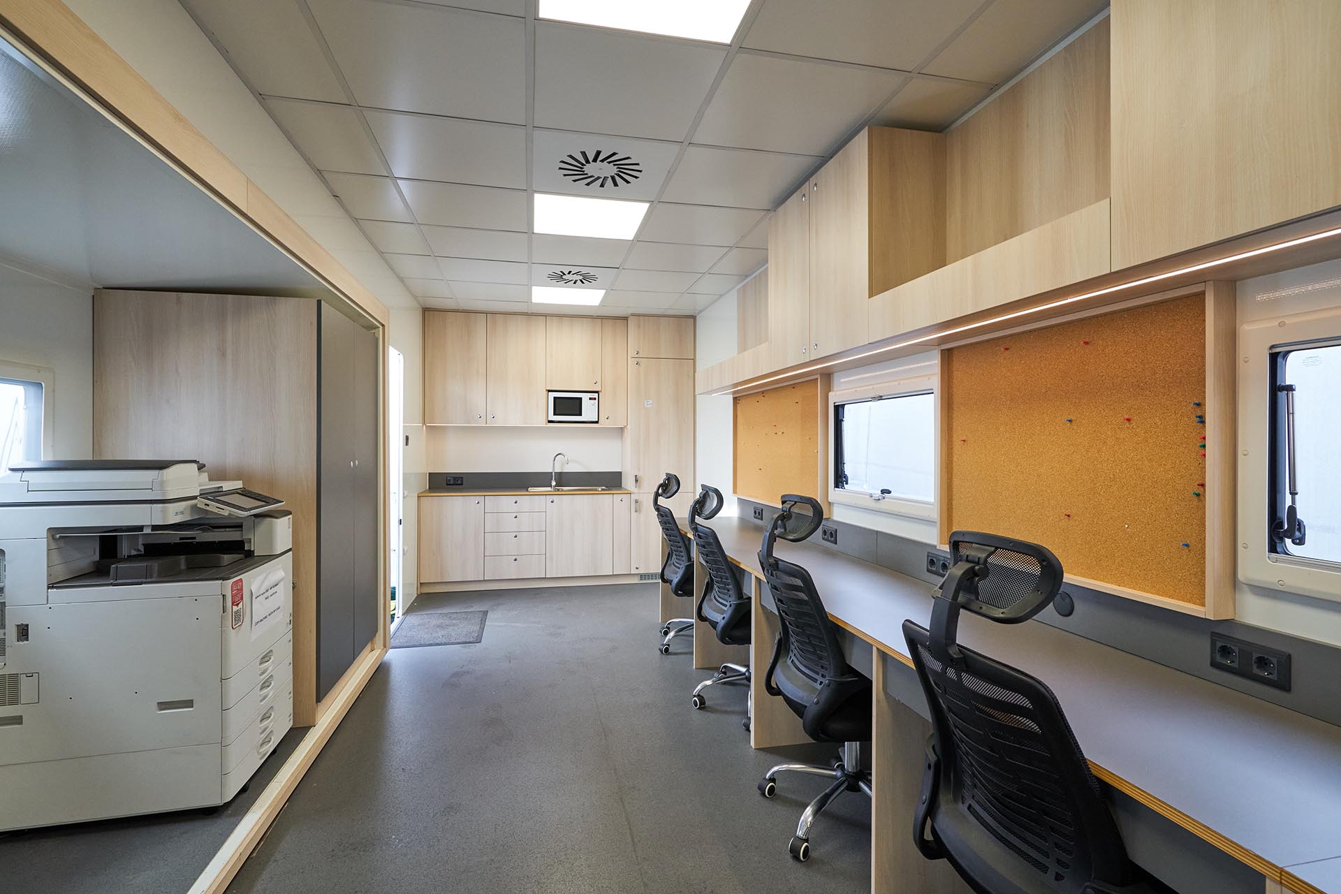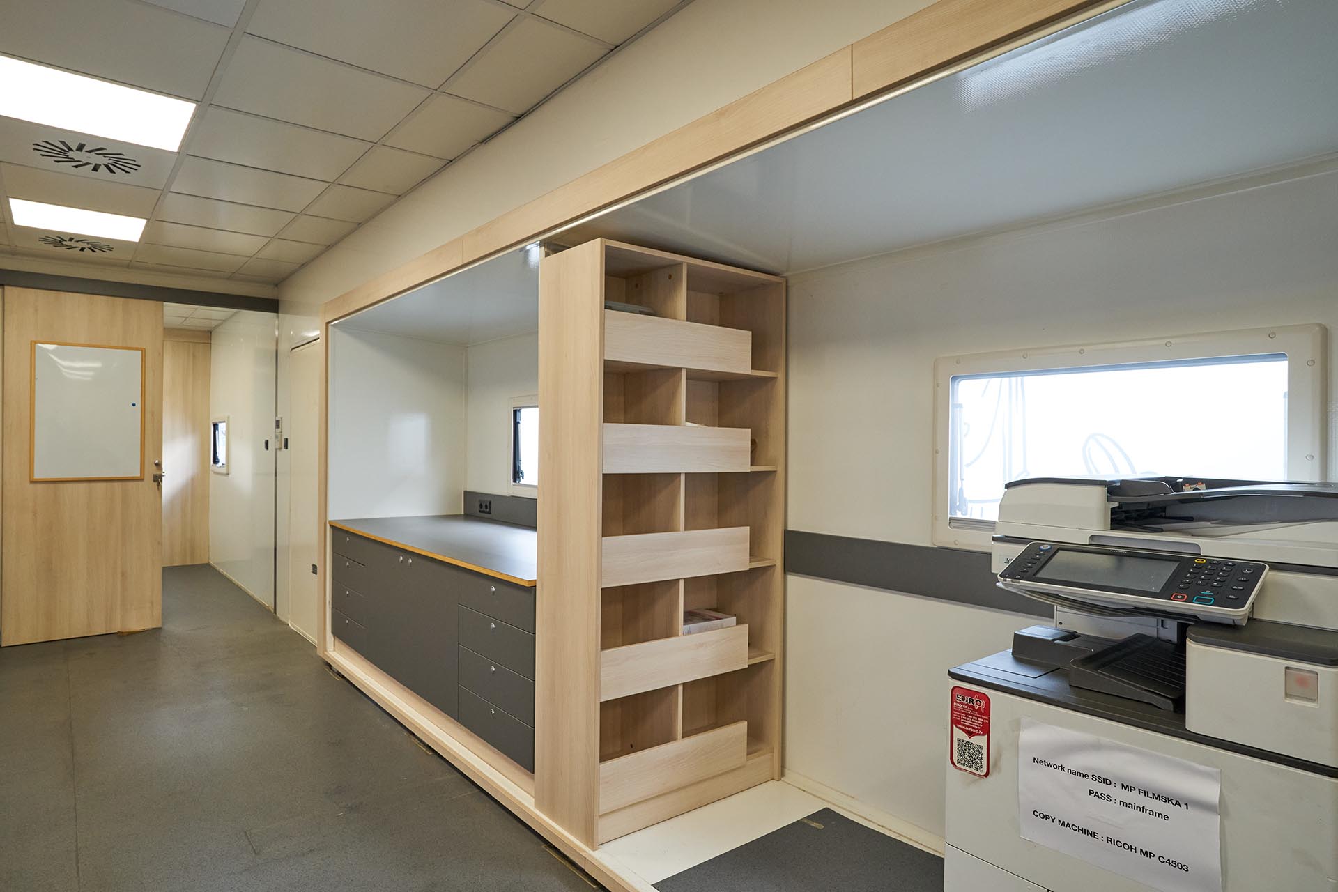 The main area features desks and chairs, built-in cabinets and drawers for storage, Wi-Fi, and a copy machine — everything essential to keep your production team running efficiently.